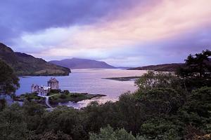 Purple sunset between the three lakes that suround Eilean Donan Castle